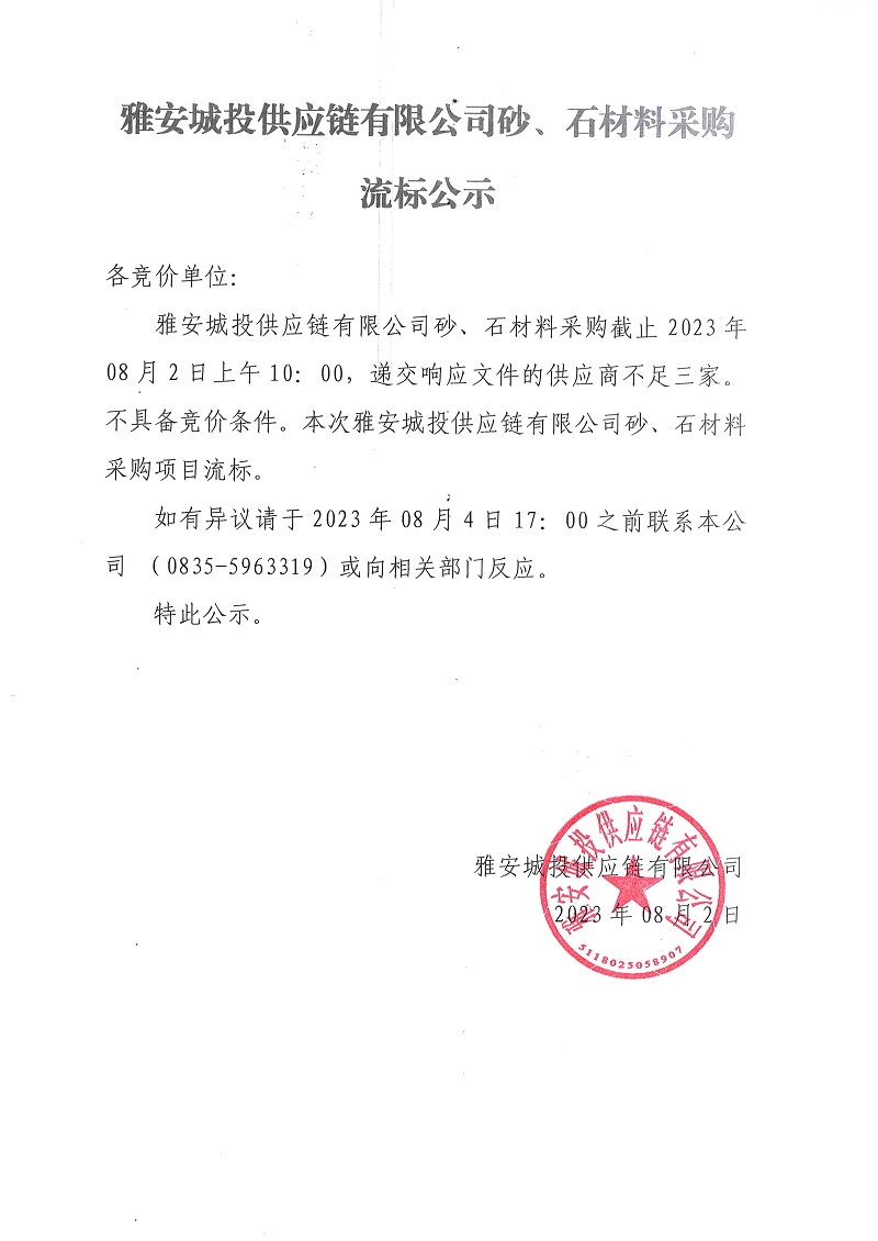 雅安城投供應(yīng)鏈有限公司砂、石材料采購(gòu)流標(biāo)公示